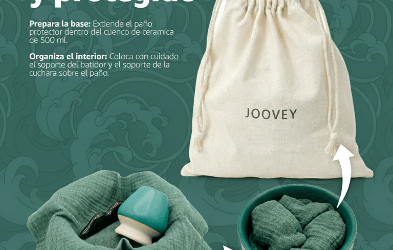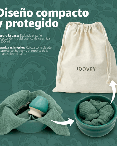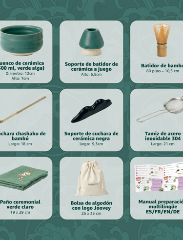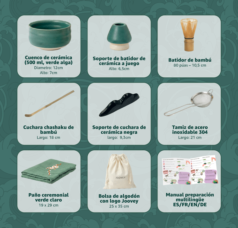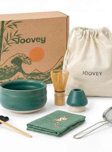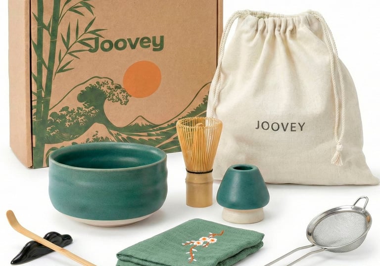 Kit ceremonial Joovey con 8 piezas, diseño compacto y materiales premium para preparar un matcha suave y espumoso.